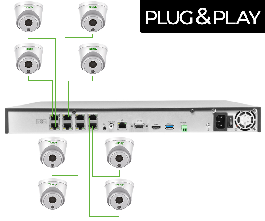 Zestaw zawiera: Dzięki zastosowaniu w rejestratorze Tiandy wbudowanych switchy PoE łatwo i szybko podłączysz cały zestaw. Cała konfiguracja odbywa się automatycznie, a ty po chwili cieszysz się poprawnie funkcjonującym zestawem wysokiej jakości monitoringu od Tiandy.