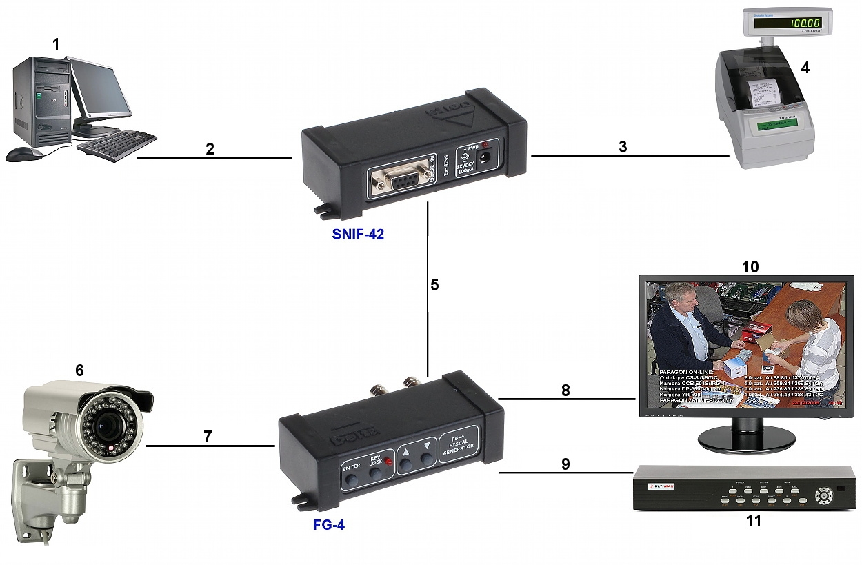 Urządzenie FG-4 umożliwia przechwytywanie danych wysyłanych do drukarki fiskalnej i umieszczanie ich w obrazie pochodzącym z kamer CCTV. Od strony sygnału wideo FG-4 działa jako urządzenie przelotowe, posiadające wejście i wyjście sygnału PAL. Pozwala to na wyświetlenie obrazu z kamery CCTV, z jednoczesnym umieszczeniem listy produktów rejestrowanych na stanowisku kasy fiskalnej.