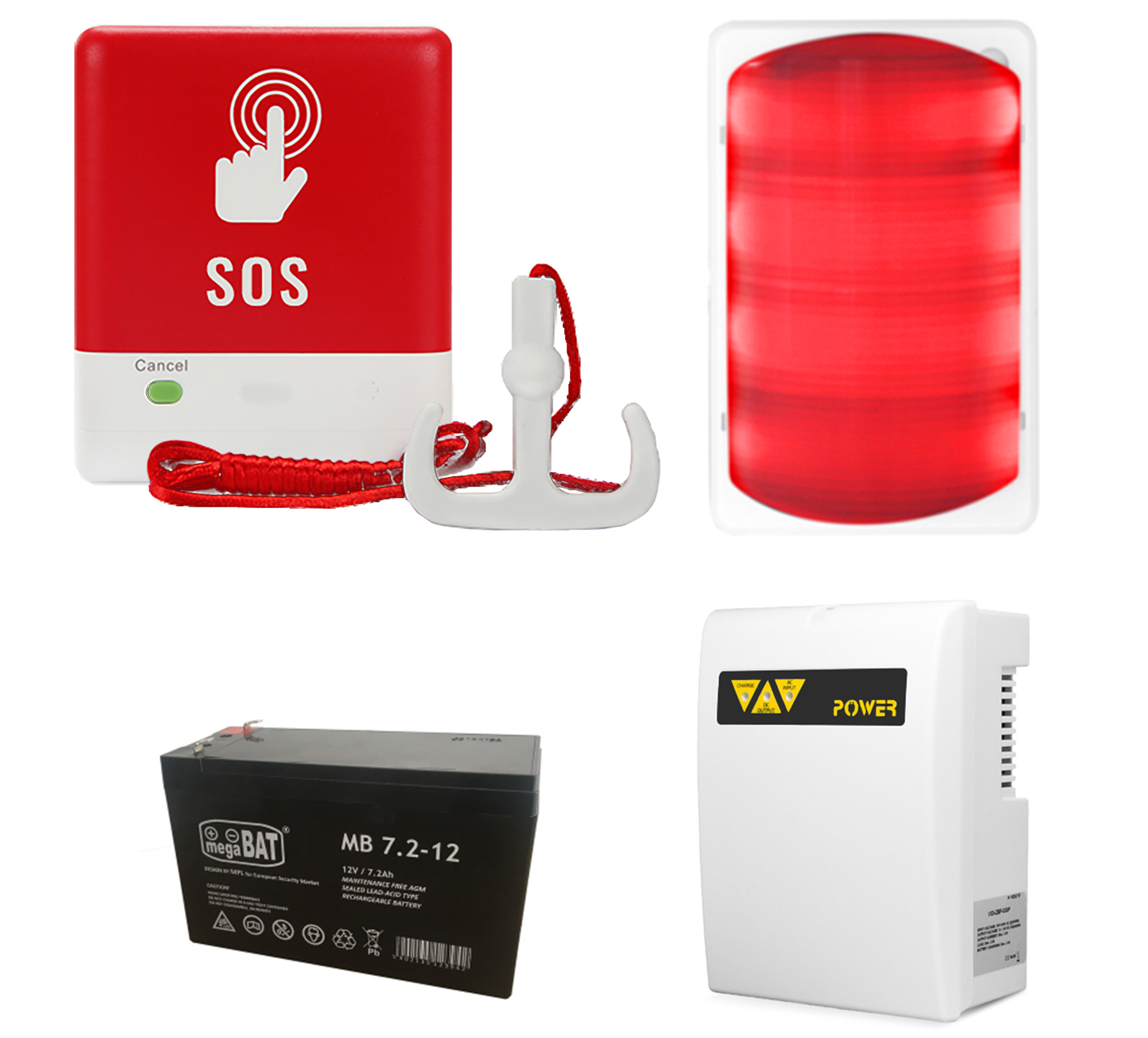 Zestaw do WC dla osób niepełnosprawnych (z zasilaniem awaryjnym) Bezprzewodowy system przywoławczy Kaler znajduje zastosowanie w każdej toalecie. Przycisk pociągowy montujemy w pobliżu muszli toaletowej, tak aby znajdował się w łatwo dostępnym miejscu dla osoby korzystających z WC lub leżącej na posadzce (np. w przypadku utraty równowagi ). Osoba, która potrzebuje pomocy pociąga za sznurek przycisku pociągowego, a znajdujący się nad drzwiami sygnalizator optyczno-akustyczny informuje o konieczności udzielenia pomocy.