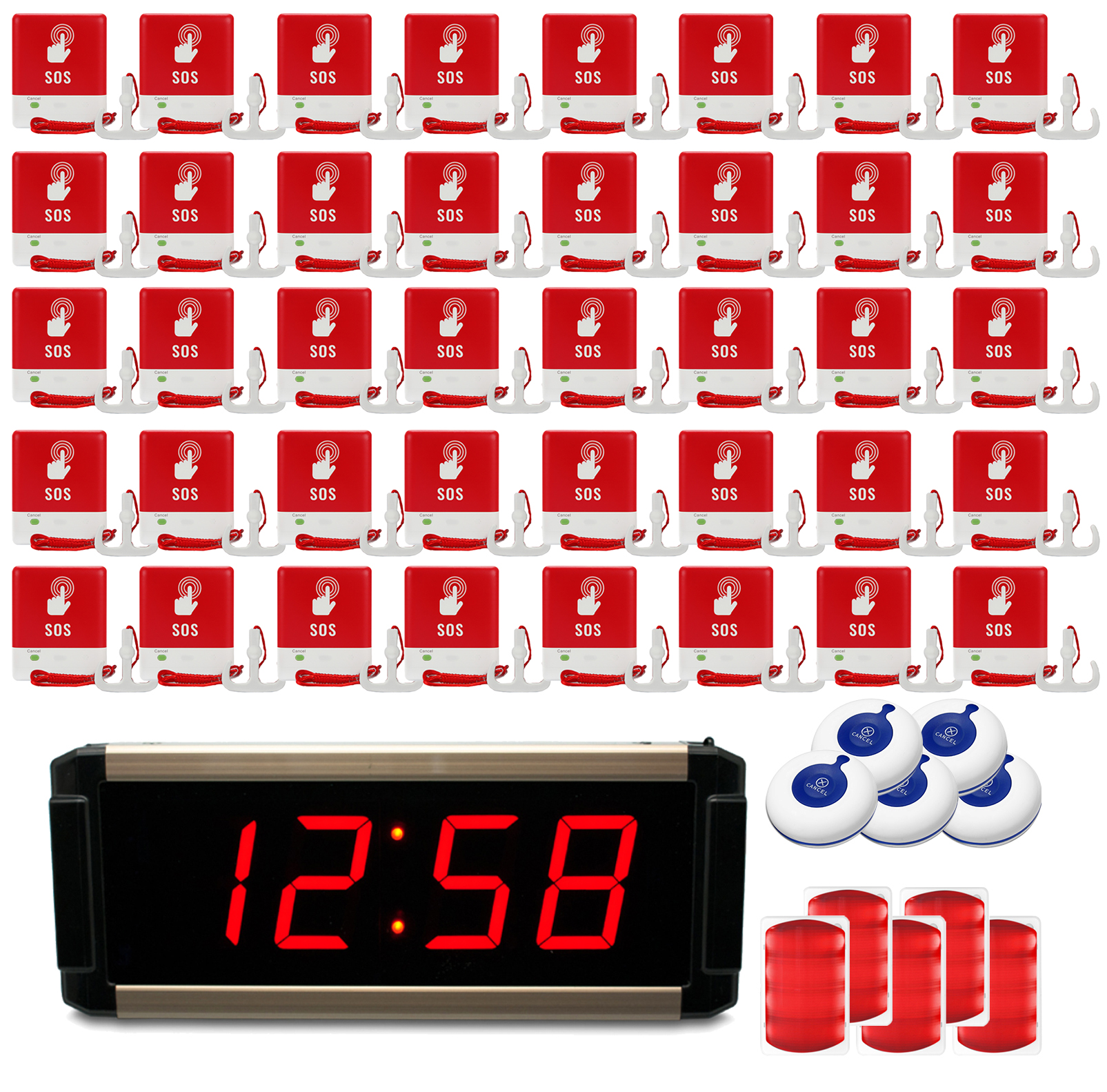 W skład zestawu wchodzą: Tablica przywoławcza GEN-48 x 1szt., Bezprzewodowy przycisk na kablu GEN-ST2 x 20szt., Bezprzewodowy przycisk kasowania GEN-CC x 5szt, Bezprzewodowy sygnalizator optyczno-akustyczny GEN-L2 x5szt.