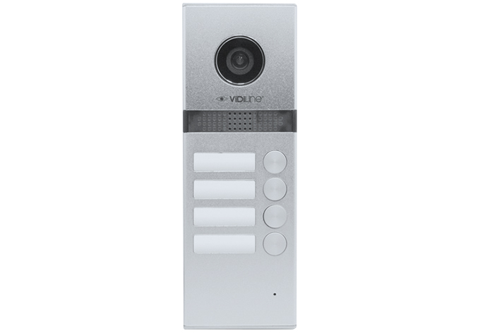 Cztero rodzinny panel wideodomofonowy VIDI-MVDP-D4 x 1 szt. Panel wideodomofonowy przeznaczony jest do systemu 4-rodzinnego. Wykonany jest ze stopu aluminium, montowany natynkowo. Posiada również moduł kamery z diodami podczerwieni co umożliwia widzenie w nocy. Panel jest przystosowany do montażu na zewnątrz budynku. Otwieranie zamka czy też prowadzenie rozmowy odbywa się bez konieczności wywołania ze strony panela wewnętrznego.